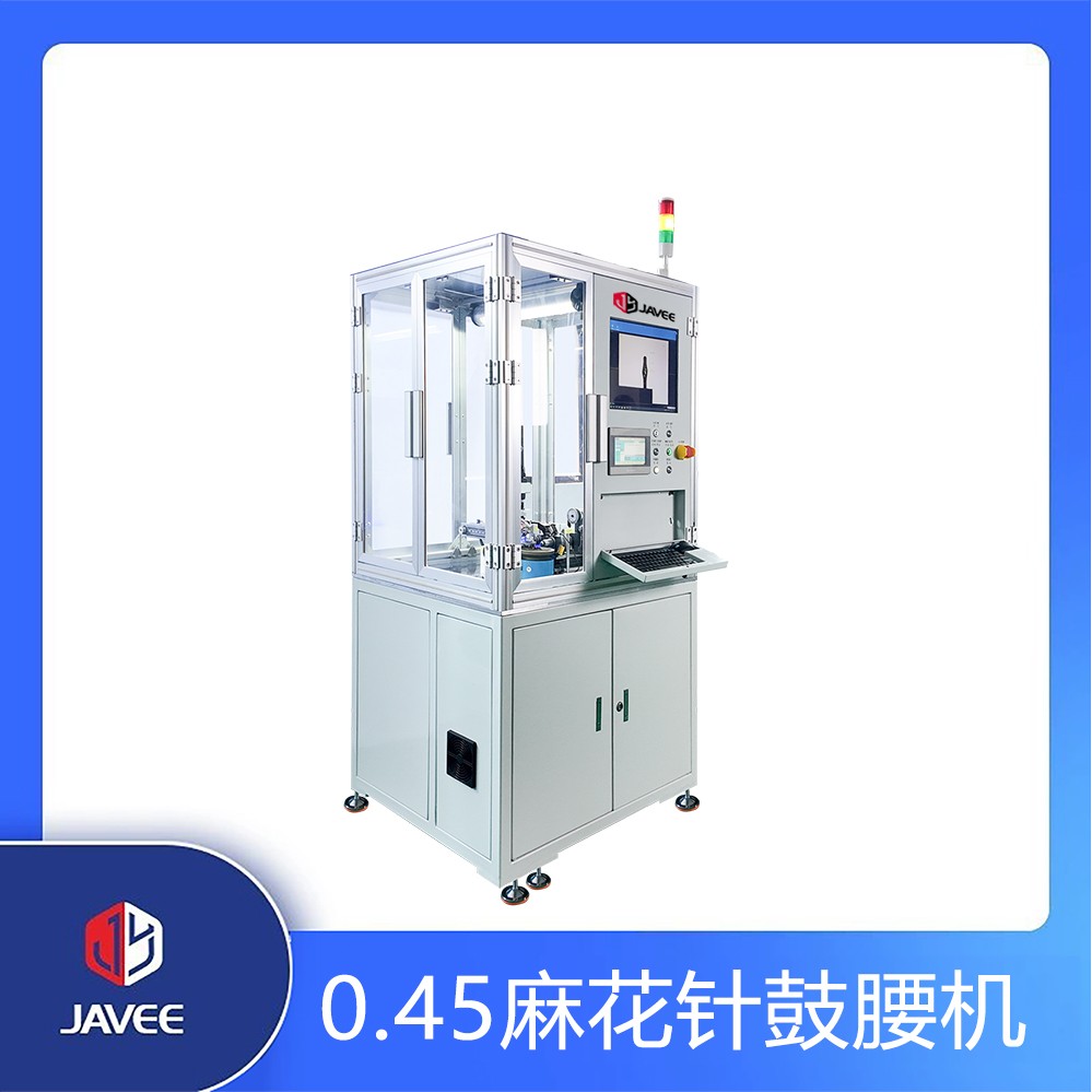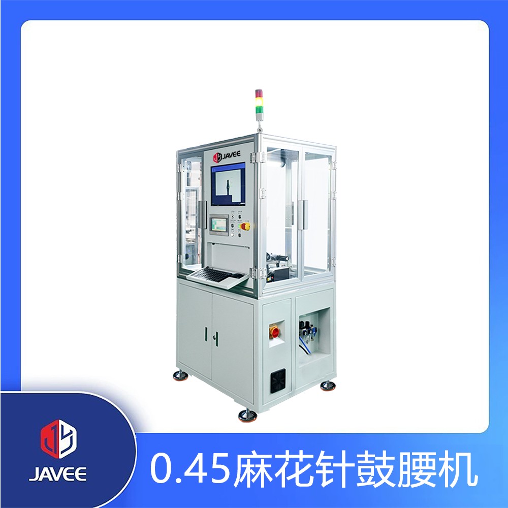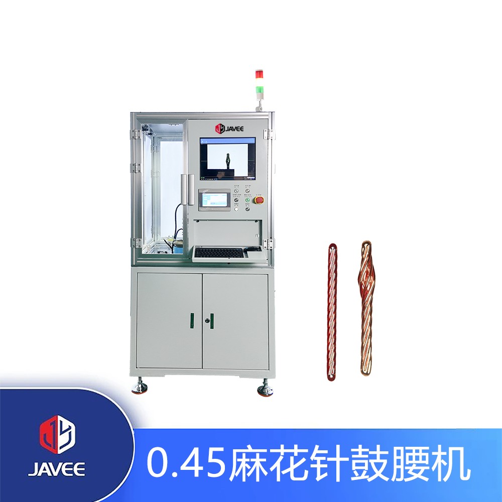 0.45麻花针自动鼓腰机主要用于麻花针鼓腰。麻花针振动盘上料,到料检测后将麻花针送入夹头,旋转鼓腰机构对夹头内产品鼓腰,视觉检测机构检测完后下料机构将成品按不同品质区分下料。旋转鼓腰机构由伺服电机驱动,可控制麻花针鼓腰尺寸大小;具备视觉检测机构,可检测鼓腰直径、长度,确保成品无歪头、伤丝、分丝、鼓型不均匀等不良状态,保证了设备的高稳定性和质量,提高了整机的生产效率。